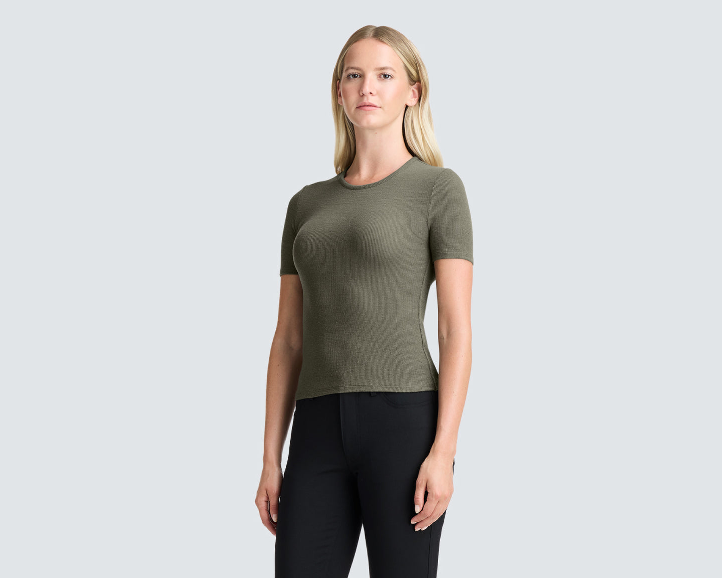 The fitted tee you’ll reach for every time. Enhanced with the natural performance of Merino wool, this ribbed closet staple is made with a fitted fabric, making it perfect for effortless layering.